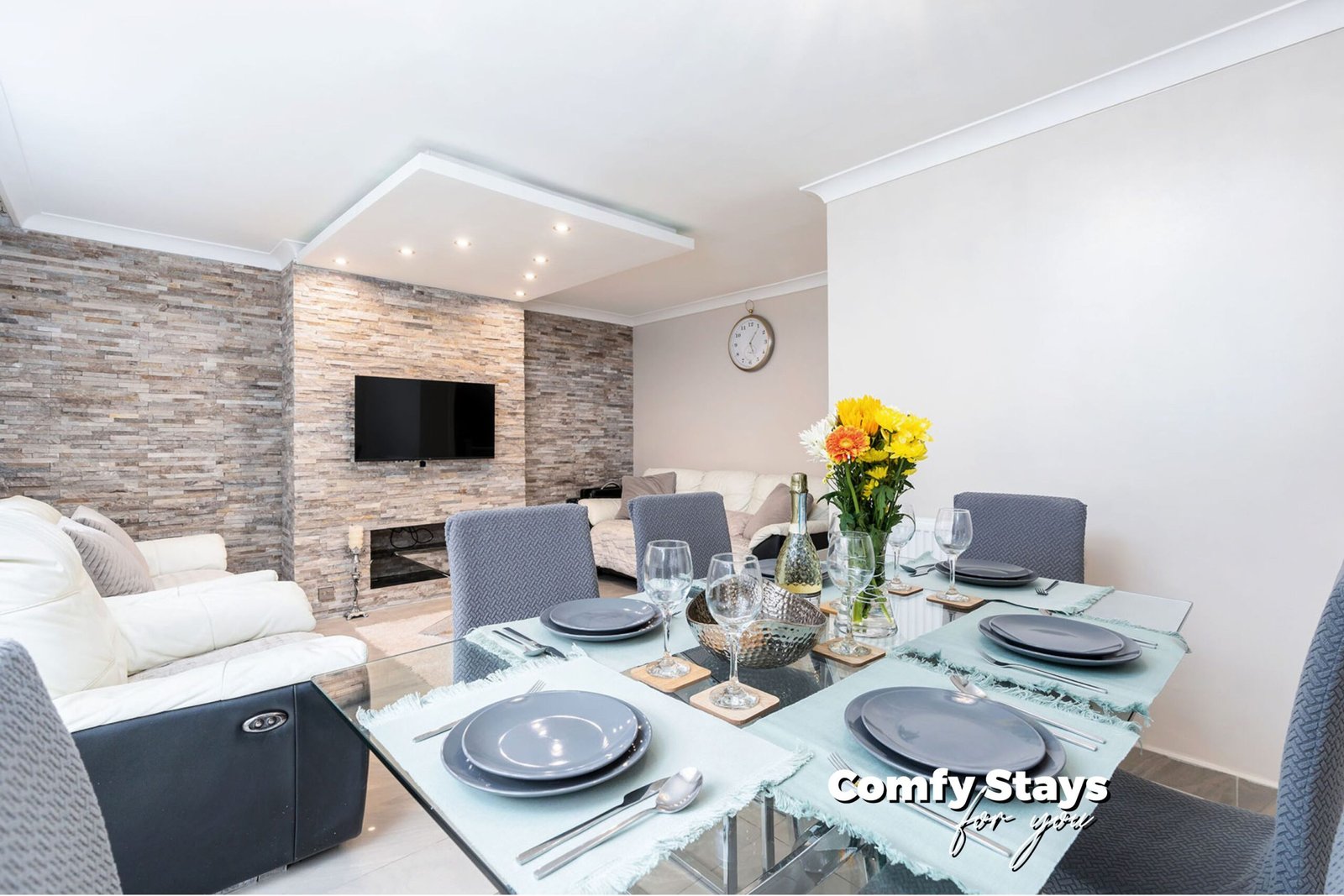 The open-plan living space is designed for relaxation, with a 3-seat and 2-seat leather sofa and a comfy armchair. A 43-inch Smart TV mounted on a stylish stone feature wall offers the perfect spot to stream your favourite shows. The dining area, featuring a sleek glass table and six seats, is excellent for shared meals or morning coffee.