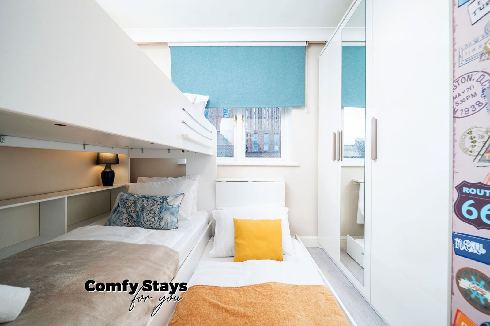 This room includes a bunk bed for two guests and a third pull-out bed. It also has a wardrobe, two table lamps, and a blackout blind. Please note that when the third bed is in use, the wardrobe door won’t fully open.